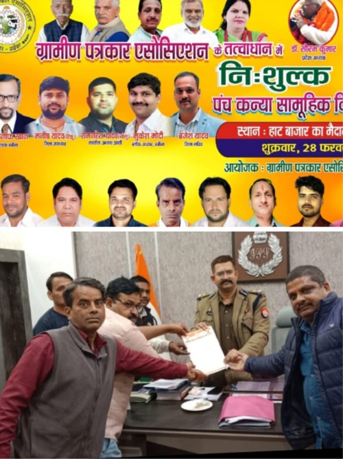 ग्रामीण पत्रकार एसोसिएशन बबीना के तत्वाधान में आगामी 28 फरवरी 2025 दिन शुक्रवार को बबीना के बुध बाजार में निशुल्क पंच कन्या विवाह महोत्सव का आयोजन किया जाना सुनिश्चित किया गया है आयोजकों द्वारा जिसकी तैयारियां शुरू कर दी गई है आयोजकों ने बताया कि यह विवाह महोत्सव पूरी तरह से निशुल्क होगा जिसमें वर और वधू पक्ष केवल शगुन के तौर पर केवल 11, 11 रुपए और एक नारियल लिया जाएगा बताया कि विवाह महोत्सव हेतु अत्यंत गरीब पांच जोड़ चयनित किया जा चुके हैं जो आगामी 28 फरवरी 2025 को परिणय सूत्र में बंधेगे संगठन की ओर से नव विवाहित जोड़ों को घर की जरूरत का दहेज का सामान उपहार स्वरूप प्रदान किया जाएगा ऐसी सिलसिले में ग्रामीण पत्रकार एसोसिएशन का एक प्रतिनिधिमंडल सोमवार को ग्रामीण पत्रकार एसोसिएशन के जिला अध्यक्ष अभिनंदन जैन के नेतृत्व में डीआईजी झांसी केशव कुमार चौधरी से मिला जिसमें संगठन के प्रतिनिधि मंडल ने डीआईजी को आमंत्रण पत्र दिया जिसे डीआईजी ने स्वीकार करते हुए कार्यक्रम में आने की सहमति देदी ताकि उन्होंने आयोजकों को इस समाज सेवा के महान काम के लिए धन्यवाद भी दिया प्रतिनिधिमंडल में झांसी जिला अध्यक्ष अभिनंदन जैन नगर अध्यक्ष बबीना शैलेश सोनू शिवहरे, संदीप श्रीवास्तव झांसी नईम खान बबीना संजीव लाल गौतम बबीना शामिल रहे